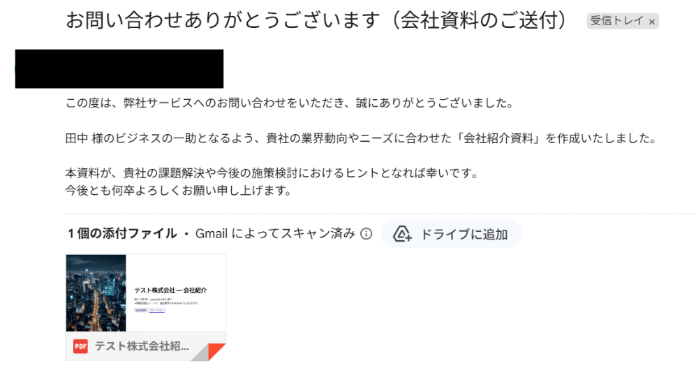 Gammaで資料を生成する際、Zoho CRMから引用する情報(会社名や担当者名など)は任意で設定することが可能です。 自動で生成される資料のファイル名は、「【株式会社〇〇様向け】会社紹介資料」のように、任意のルールに基づいて設定できます。 Outlookの「メールを送る」オペレーションでは、宛先や件名、本文の内容を、取得した見込み客の情報などを活用しながら自由にカスタマイズしてください。 ■注意事項