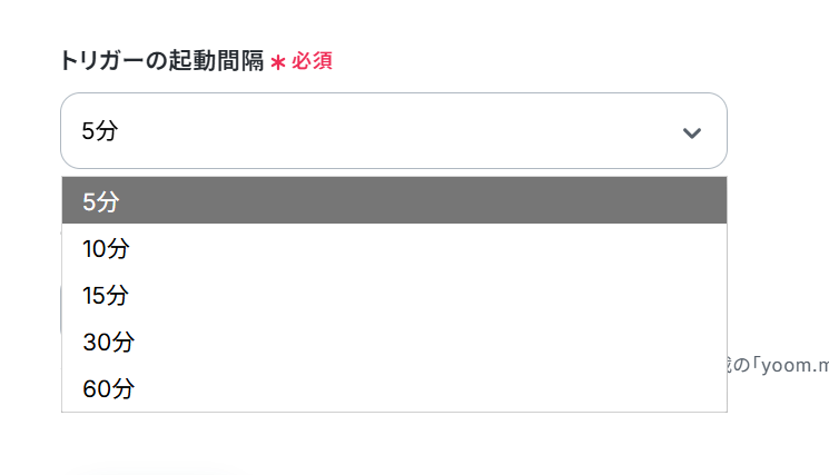 「API接続設定」画面から、トリガーの起動間隔を選択します。 トリガーの起動間隔はプルダウンより5分、10分、15分、30分、60分の間隔から選択してください。