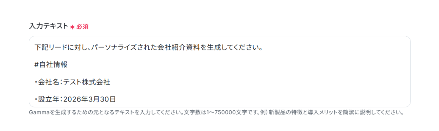 「入力テキスト」に生成するための指示内容を入力します。 画像では自社情報を設定しています。