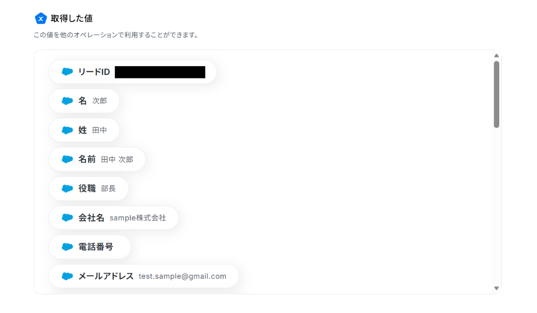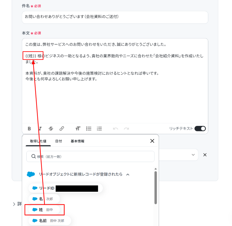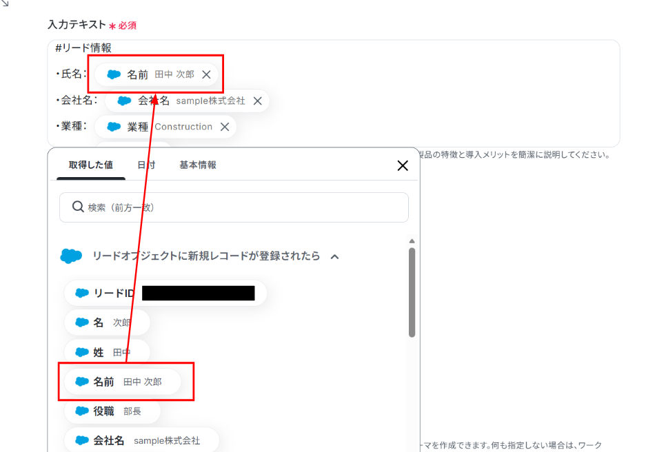 入力テキストの下に進み、リード情報を入力します。「取得した値」を使うことで、都度変更することなくSalesforceの最新の情報を反映することができます。