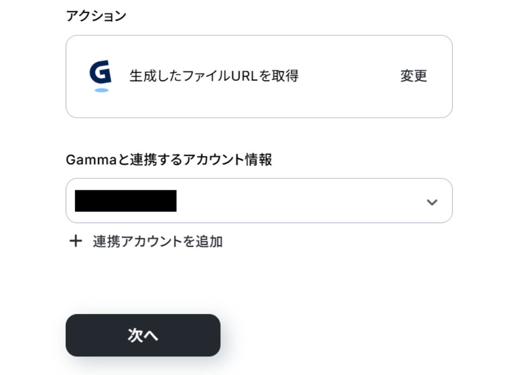 Gammaと連携するアカウント情報に誤りがないかを確認し、アクションは「生成したファイルURLを取得」のままで「次へ」をクリックします。