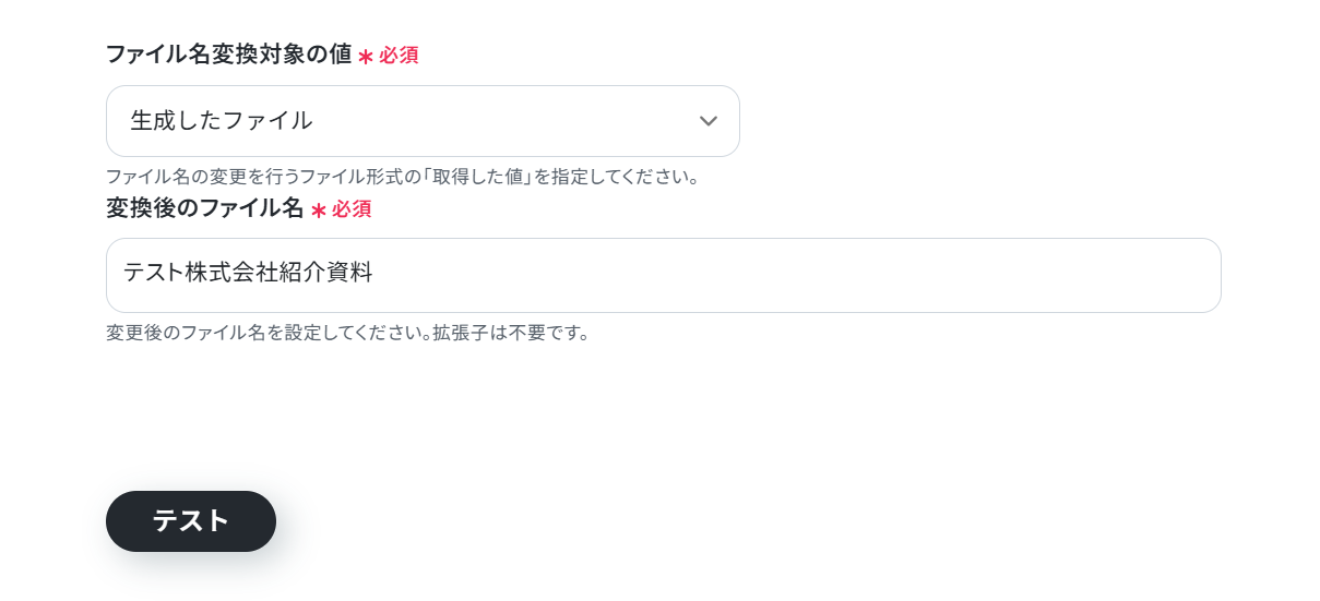 変換後のファイル名:変更したいファイル名を入力 取得した値を活用して、「【株式会社〇〇様】会社紹介資料」のよう設定することもできます。テキストを直接入力した箇所は、固定値としてすべての連携に反映されます。