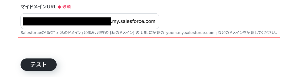 赤線を確認の上、「マイドメインURL」を入力します。 入力が終わったら「テスト」をクリックしましょう!