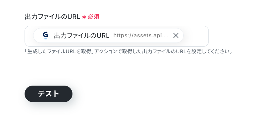 「出力ファイルのURL」に前工程で取得した値を入力します。 入力が終わったら「テスト」をクリックしましょう!
