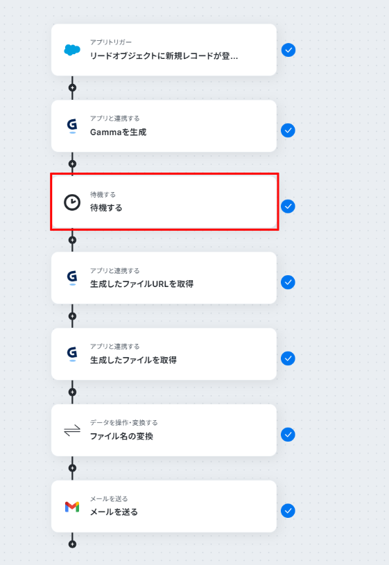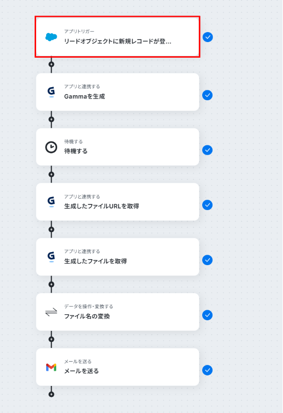 はじめに、Salesforce、Gamma、GmailをYoomと連携します。 次に、トリガーでSalesforceを選択し、「リードオブジェクトに新規レコードが登録されたら」というアクションを設定します。 オペレーションでGammaの「Gammaを生成」を設定し、Salesforceから取得したリード情報をもとにスライドを生成します。 スライドの生成時間を考慮し、オペレーションで「待機する」アクションを設定します。 続けてGammaの「生成したファイルURLを取得」「生成したファイルを取得」アクションを順に設定します。 オペレーションの「ファイル名の変換」を用いて、ダウンロードしたファイル名を任意の名前に変更します。 最後にGmailの「メールを送る」アクションを設定し、生成したスライドを添付してリード宛にメールを自動送信します。 ※「トリガー」:フロー起動のきっかけとなるアクション、「オペレーション」:トリガー起動後、フロー内で処理を行うアクション■このワークフローのカスタムポイント