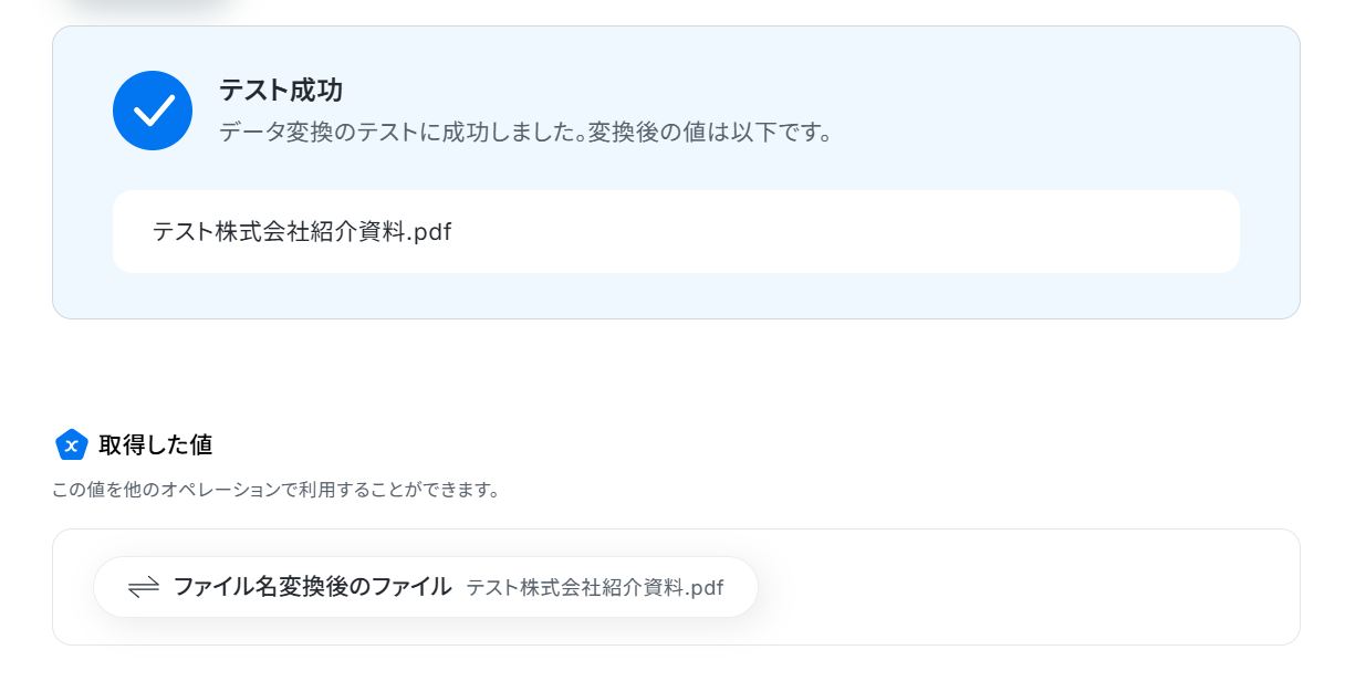 テストに成功しました! 取得した値に「ファイル名変換後のファイル」が追加されました。 「完了」をクリックして最後の工程に進みましょう。