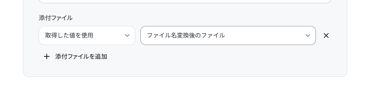 添付ファイルは下の画像のように、プルダウンから「取得した値を使用」「ファイル名変換後のファイル」を選択します。