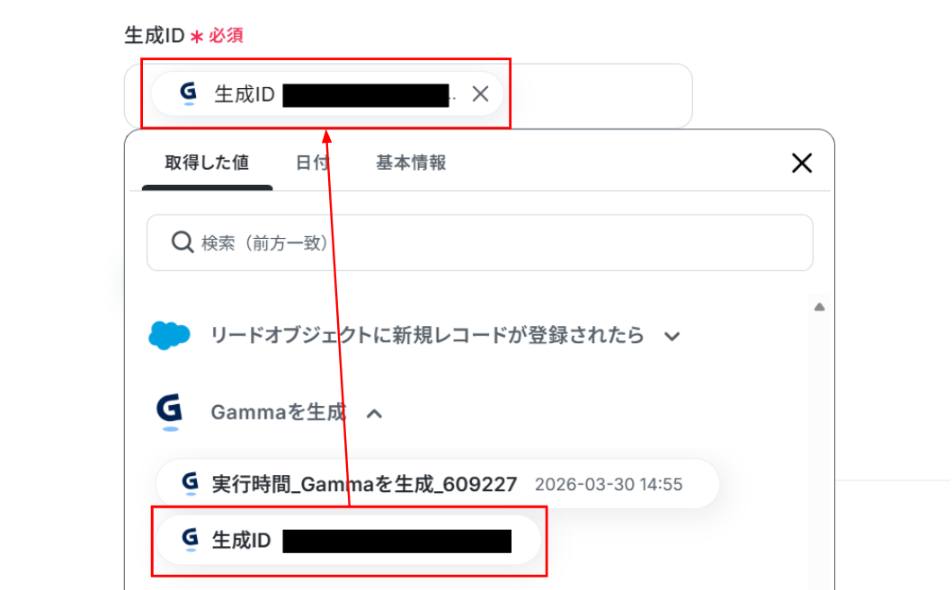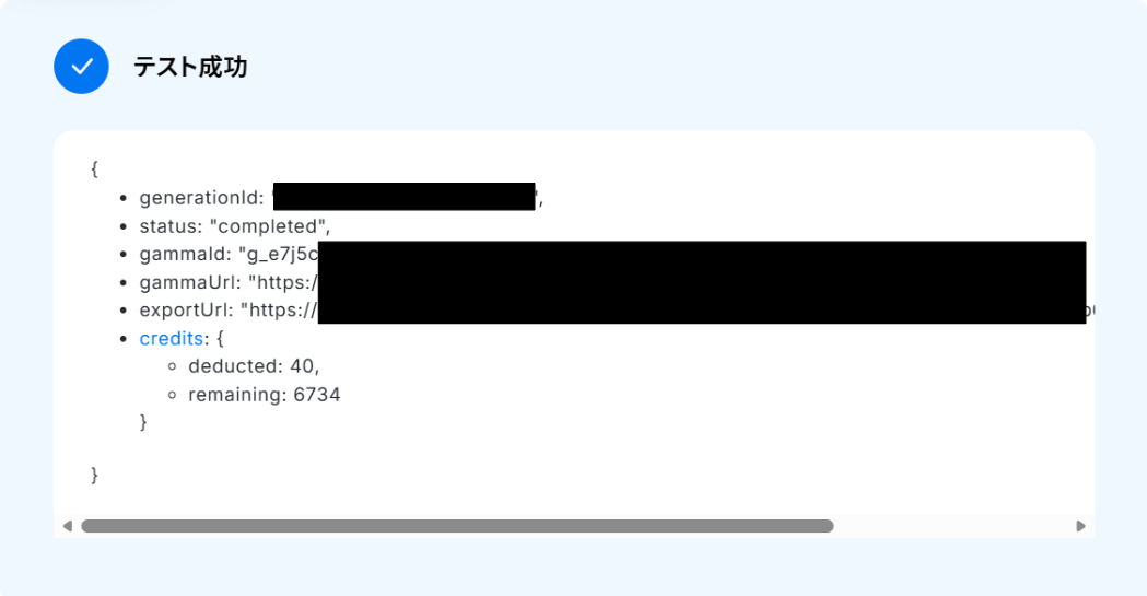 「生成ID」に「Gammaを生成」で取得した「生成ID」を使用します。 入力が終わったら「テスト」をクリックしましょう!