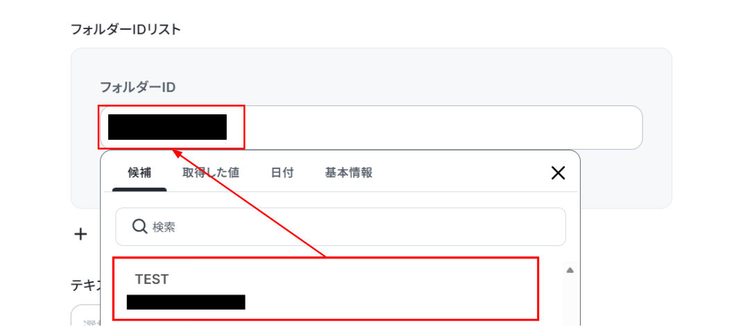 「フォルダーID」は候補から選択します。 その他の項目は必須項目ではありません。必要な項目に入力を行ってください。 入力が終わったら「テスト」をクリックしましょう!