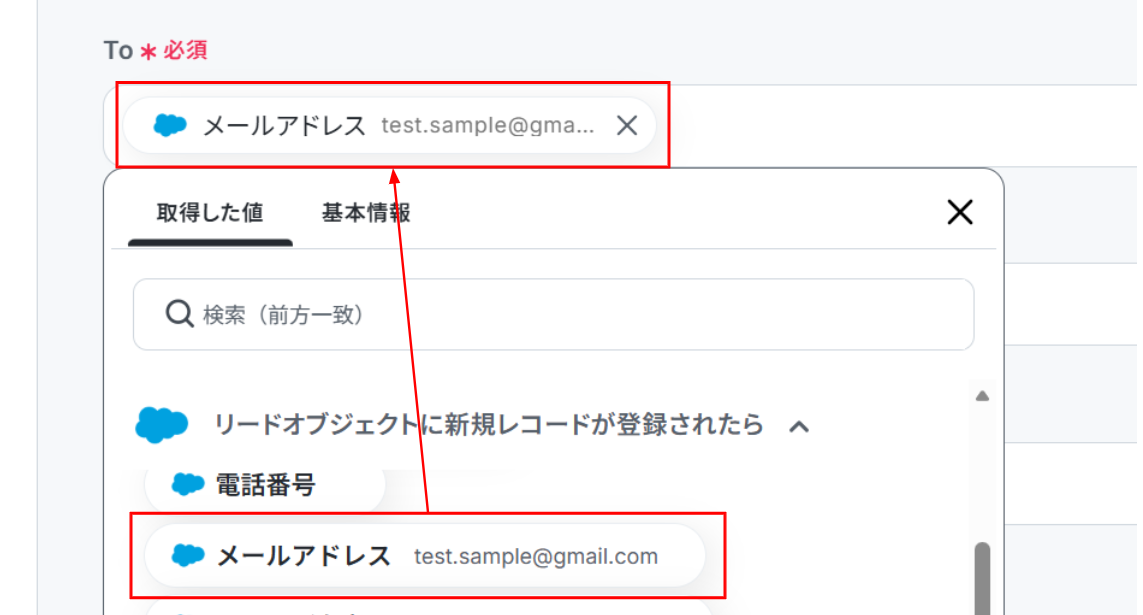 下へ進み、「To」に取得した値を使ってメールアドレスを入力します。