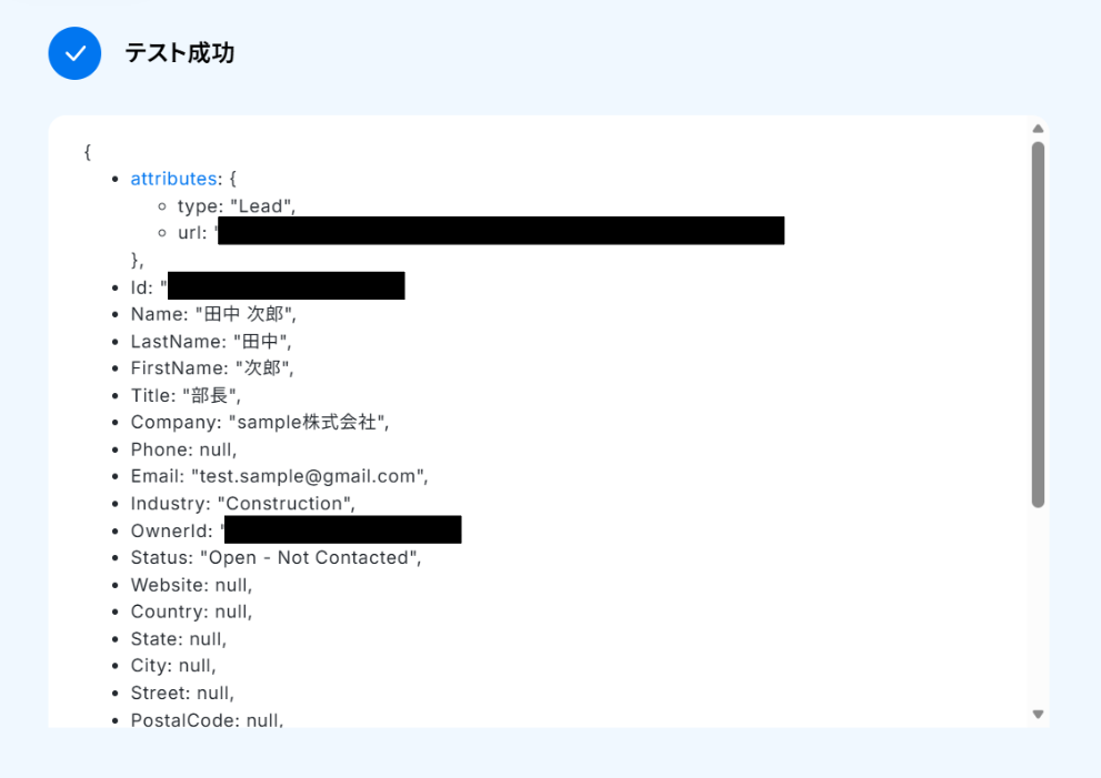 テストに成功すると「取得した値」にSalesforceの情報が反映されます。 「取得した値ってなんだろう?」と思った方は下のサイトをご参照ください。