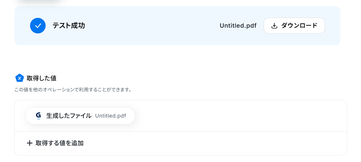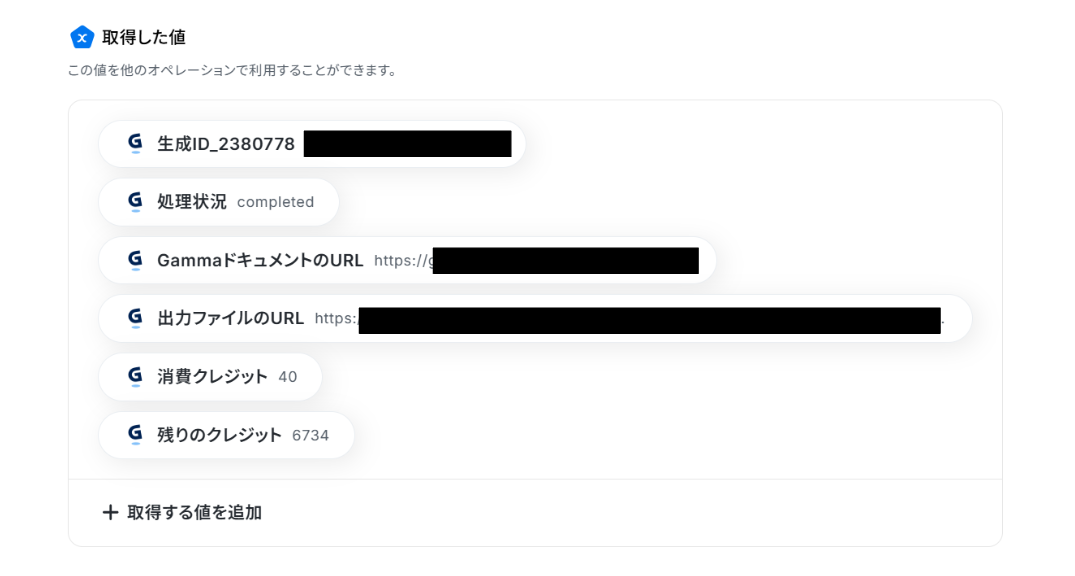 テストに成功すると、取得した値に「出力ファイルのURL」が追加されました! 「完了」をクリックして次の工程に進みましょう。