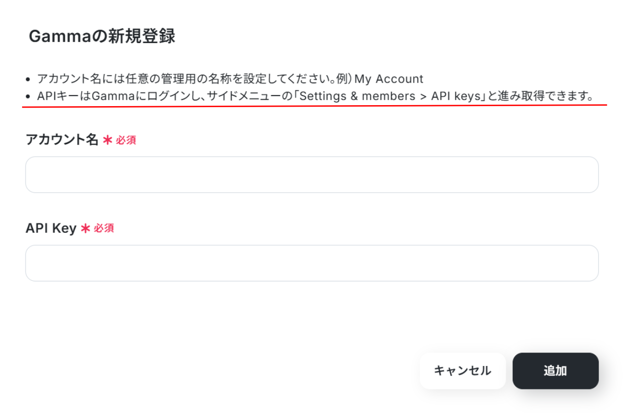 API Key:赤線を確認の上、Gammaにログインし、取得したAPI Keyを入力