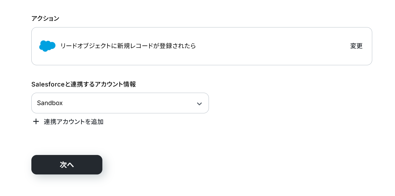 Salesforceと連携するアカウント情報に誤りがないかを確認し、アクションは「リードオブジェクトに新規レコードが登録されたら」のままで「次へ」をクリックします。