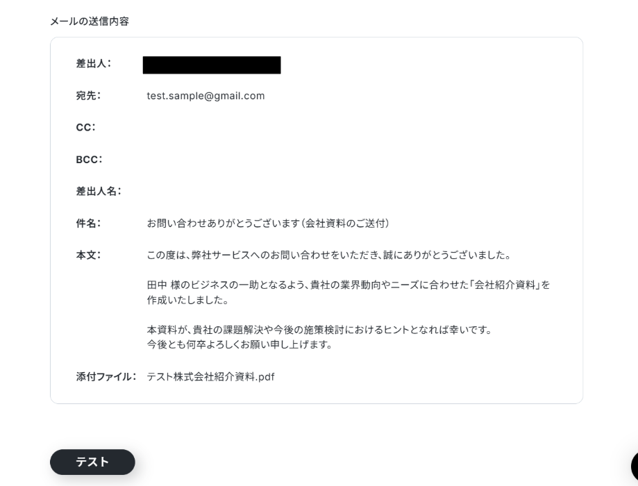 メールの送信内容を確認し「テスト」をクリックします。