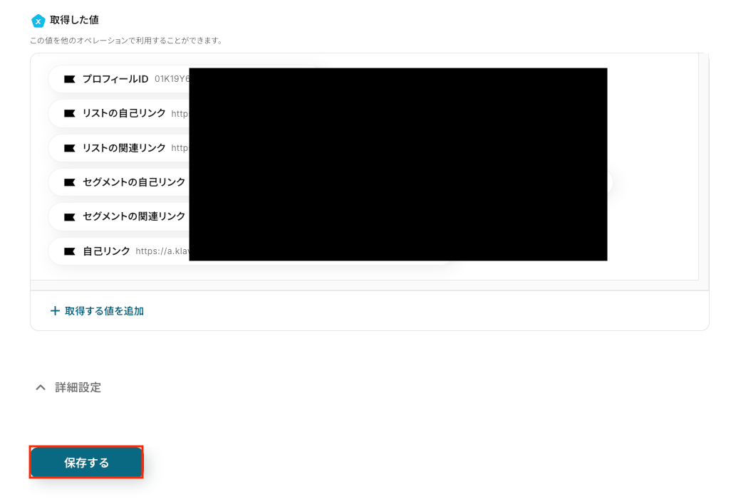 問題がなければYoomの操作画面に戻り、取得した値を確認し「保存する」をクリックします。