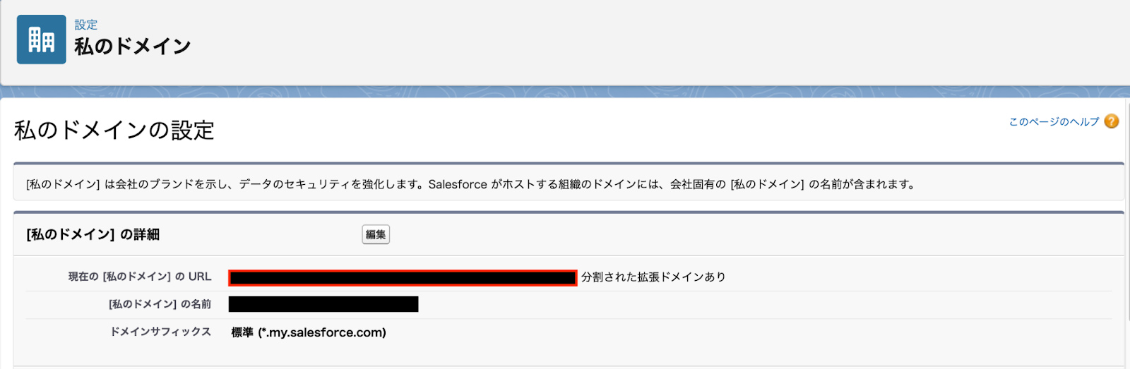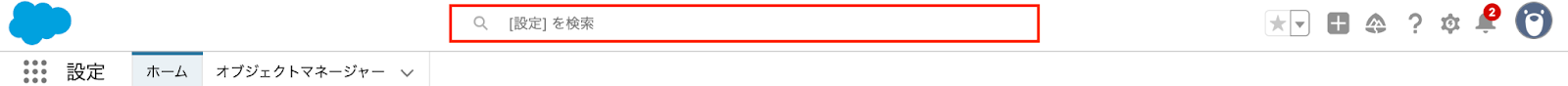 Salesforceの画面上部にある検索バー(画像の赤枠)に「私のドメイン」と入力すると、設定画面に素早くアクセスできます。