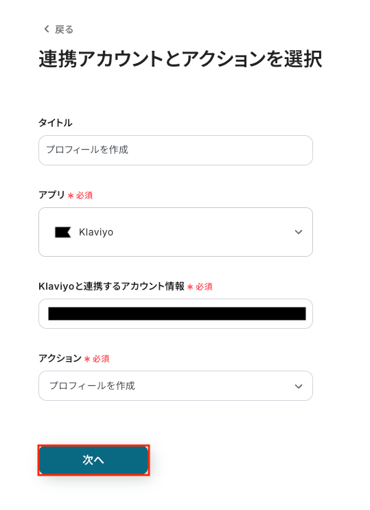 Klaviyoと連携するアカウント情報に問題がなければ、「次へ」をクリックします。