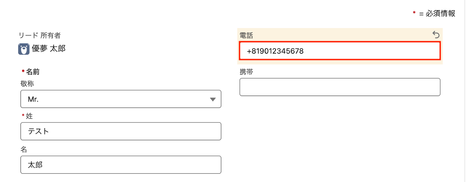 Salesforceでリードの電話番号を登録する際、Klaviyoに自動連携する場合は「国際形式(+81)」での登録が必要です。 日本国内の一般的な形式(090〜など)のまま登録してしまうと、Klaviyoにプロフィールを作成する際にエラーになります。 たとえば電話番号が「090-1234-5678」の場合は、「+819012345678」のように登録してください。