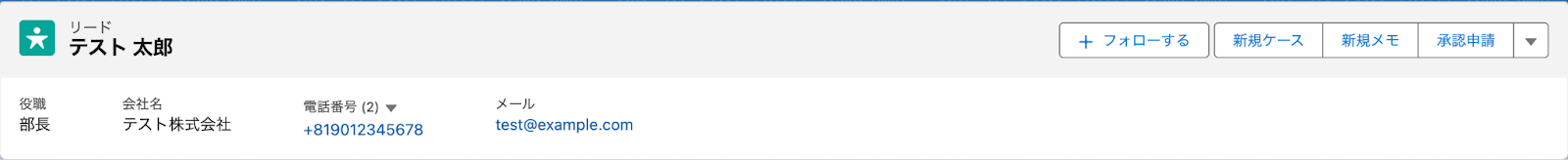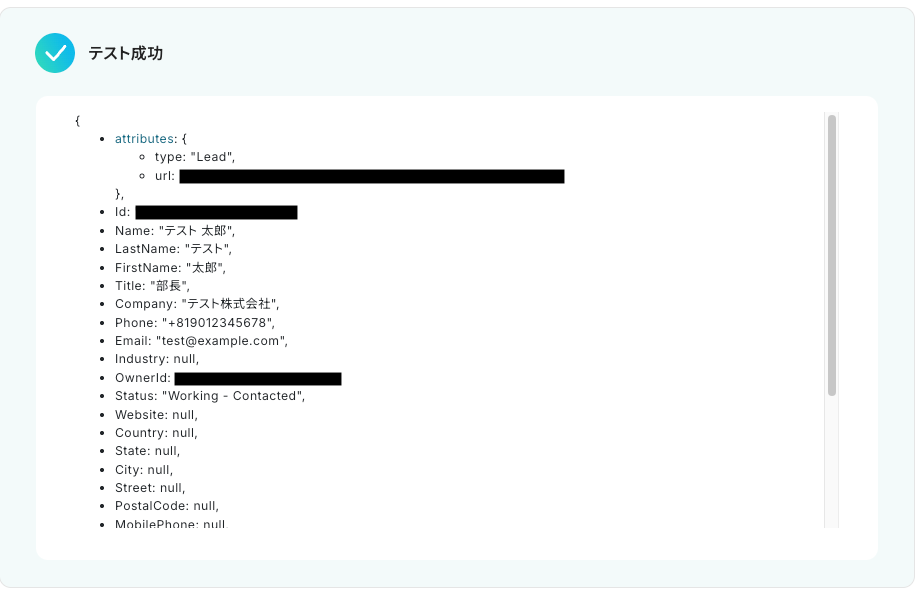 テストが成功すると、作成したリードに関する情報が一覧で表示されます。