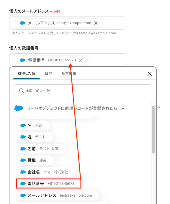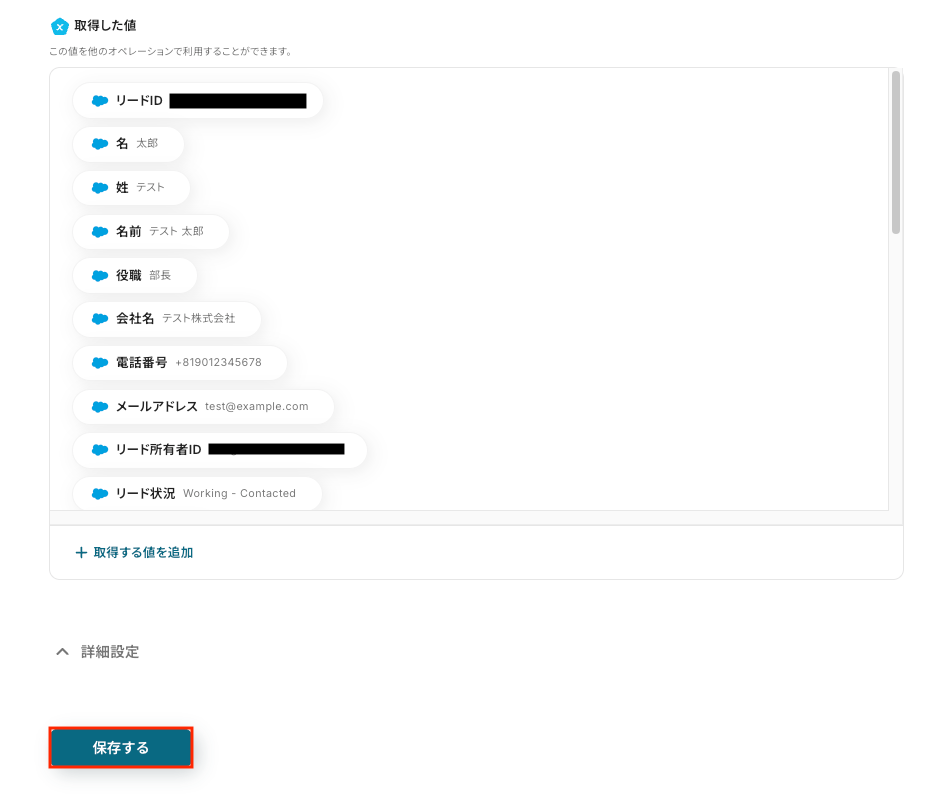 入力が完了したら「テスト」をクリックして、作成したリード情報が正しく取得されるか確認しましょう。