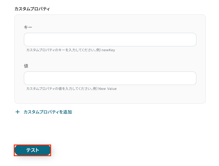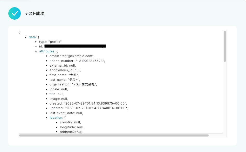 入力が完了したら「テスト」をクリックして、設定した内容でKlaviyoにプロフィールが作成されるか確認しましょう。