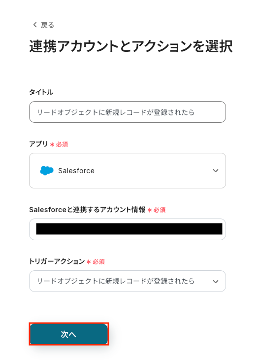 Salesforceと連携するアカウント情報に問題がなければ、「次へ」をクリックします。