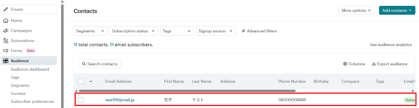 テストが成功すると、Mailchimpにコンタクトが追加されるので確認してください。