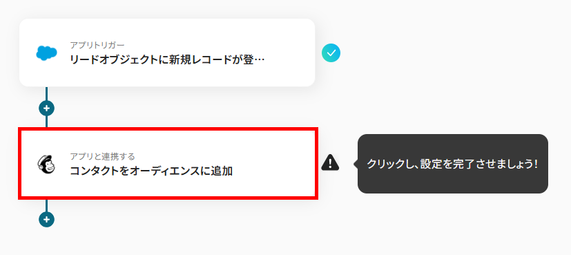 カスタム項目を連携する場合、Salesforceのトリガー設定とMailchimpのアクション設定の間で、Salesforceの「カスタムオブジェクトのレコードを取得」するアクションを設定してください。