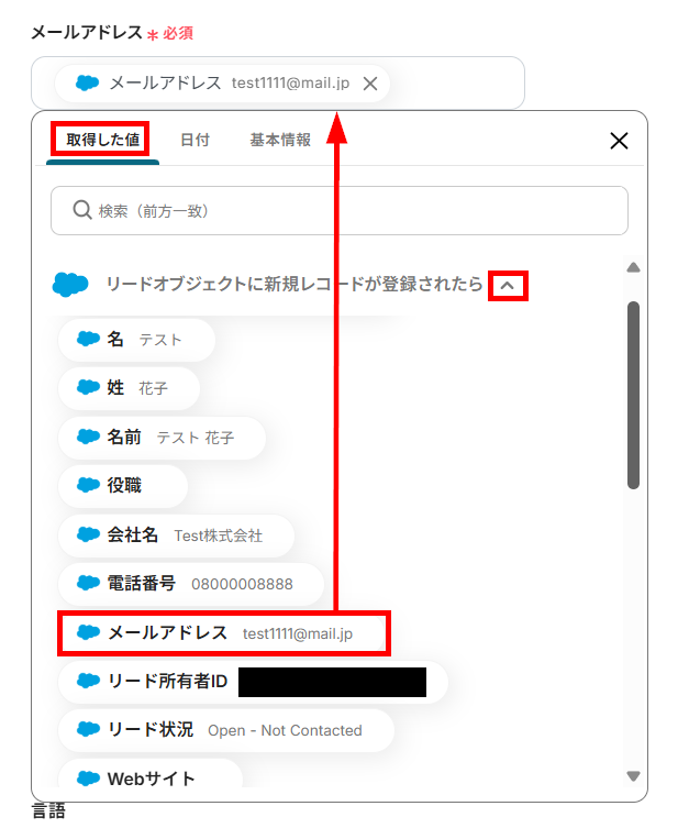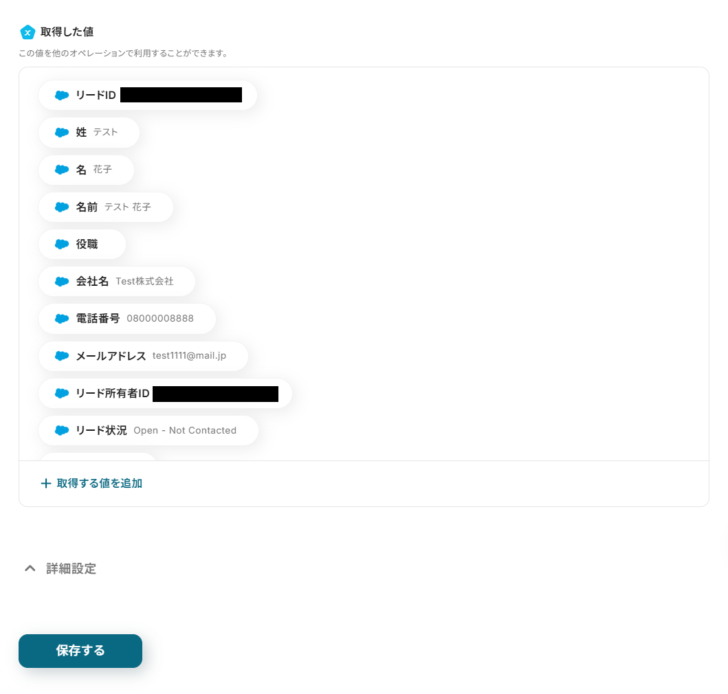 設定したら、Salesforceにリードを登録してからテストを行いましょう。テストが成功すると、Salesforceから取得した値が表示されます。
