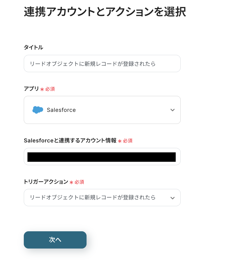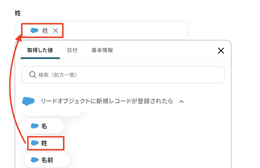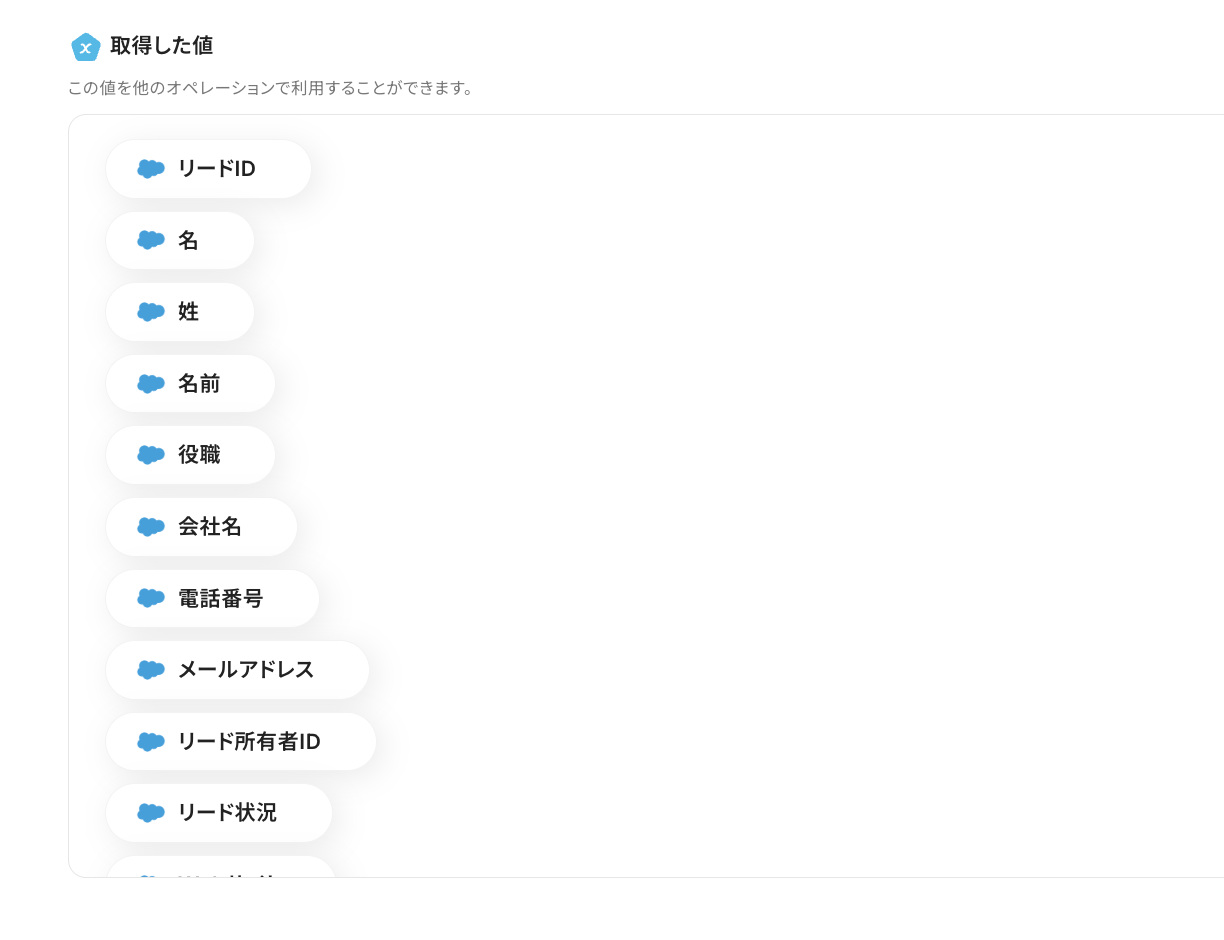 たとえば、「姓」には「取得した値」の「リードオブジェクトに新規レコードが登録されたら」内にある「姓」を選択する、といった形にそれぞれ適切なアウトプットを設定してみてくださいね!