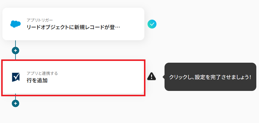 Salesforceのリードオブジェクトに新規レコードが追加されたことをYoomが検知したら、その情報を使ってSmartsheetに行を自動追加する設定を行います。
