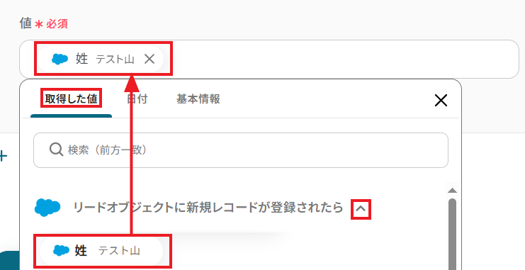 この例では「姓」のカラムIDを選択したため、Salesforceに登録した「姓」の情報を設定しました。