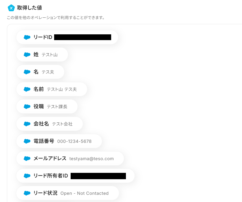 ここで取得した値を活用することにより、今後新たにSalesforceで新しくリードが追加される度、新しい内容が反映されていきます。