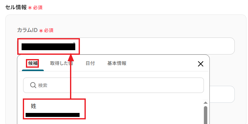 次に、Smartsheetの該当シート内で情報を連携させたいセル情報として、「カラムID」を設定します。こちらも表示される候補から選択してください。