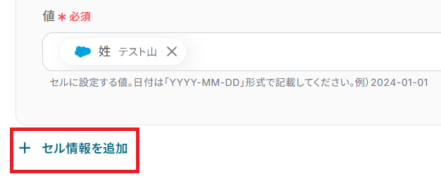 Smartsheetに連携させるセル情報の数は、「+セル情報を追加」ボタンで必要な数だけ追加できます。