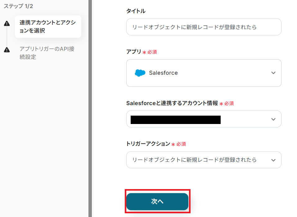 タイトルを任意で設定し、Salesforceと連携するアカウントやアクション内容を確認したら「次へ」を押してください。