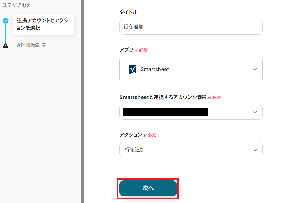 タイトルを任意で設定し、Smartsheetと連携するアカウントやアクション内容を確認したら「次へ」を押してください。