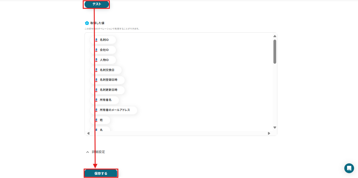 テスト成功後、先ほどSansanに登録した名刺の情報が取得した値(アウトプット)に表示されます。