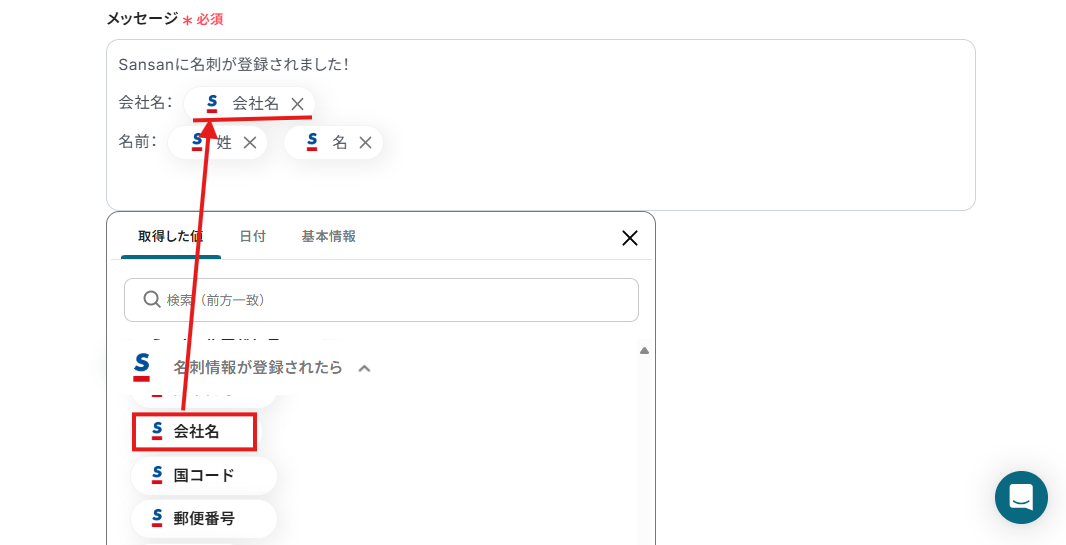 例えば下記画面のように設定すると、Sansanに新しく名刺情報が登録されたら「会社名」「姓」「名」を自動で取得し、LINE公式アカウントに通知することが可能です。