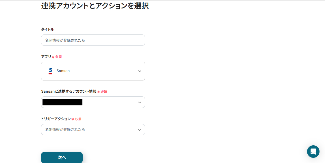 タイトルと連携するアカウント情報を任意で設定し、アクションはテンプレート通りのまま「次へ」をクリックして進んでください。