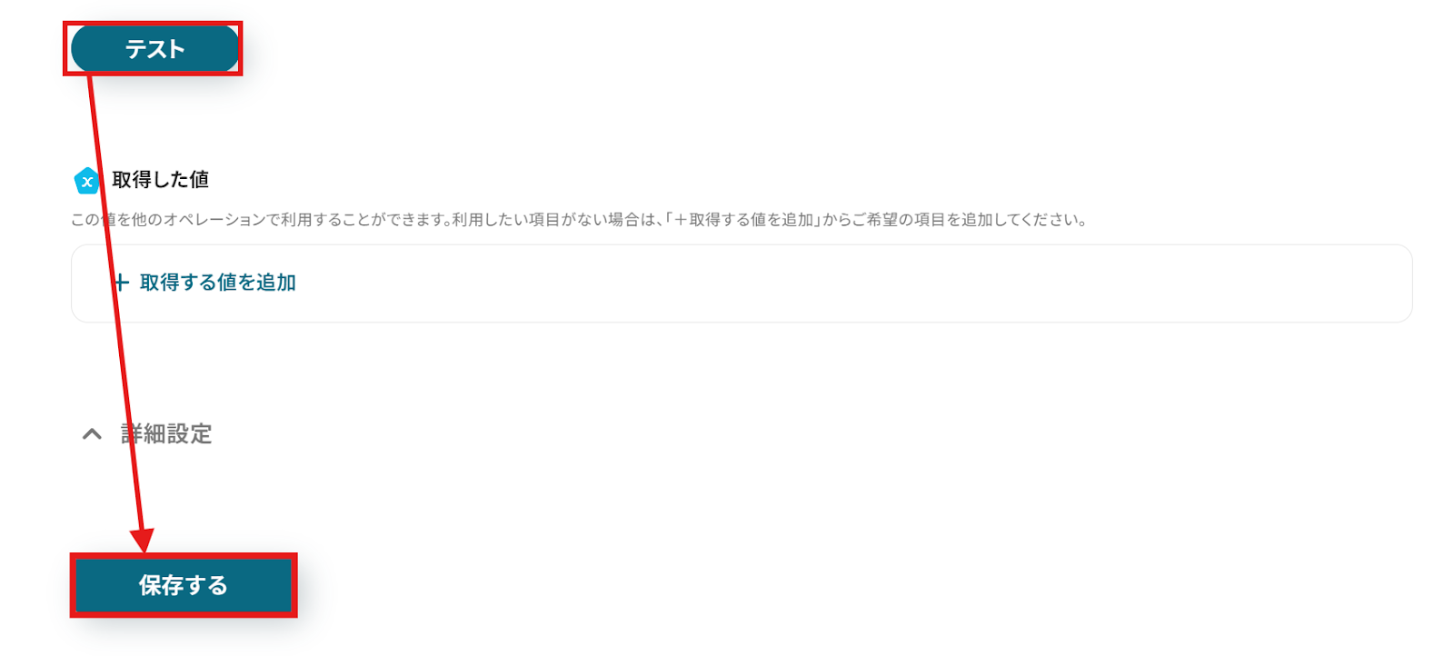 登録が終わったらYoomに戻り、「テスト」をクリックしてください。