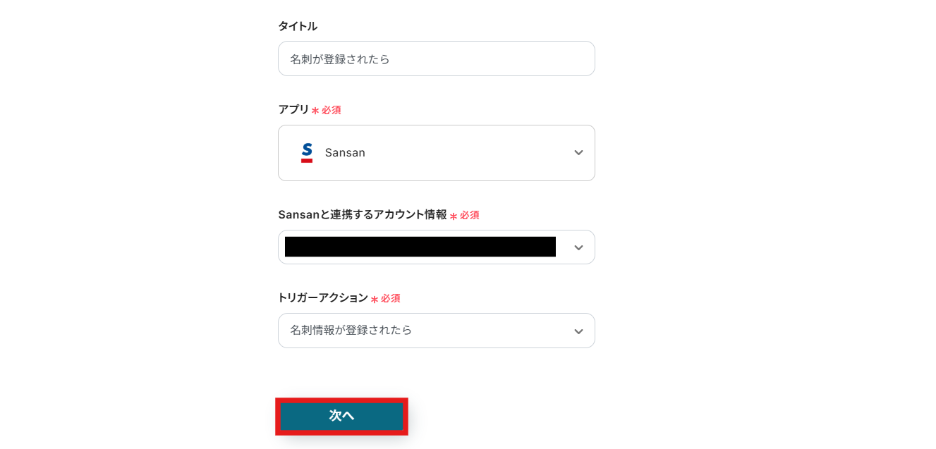 タイトルをわかりやすいものに修正して、トリガーには「名刺が登録されたら」を選べていたら「次へ」を押して進めてください。