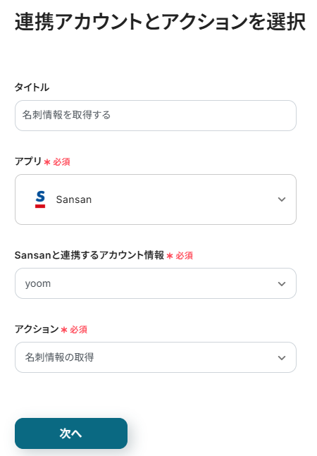先ほどと同様にタイトルと連携するアカウント情報を任意で設定し、アクションはテンプレート通りに「名刺情報を取得する」のまま下にスクロールします。