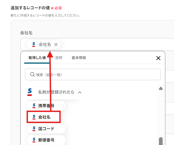 4.「追加するレコードの値」に先ほど取得したアウトプットを選択します。