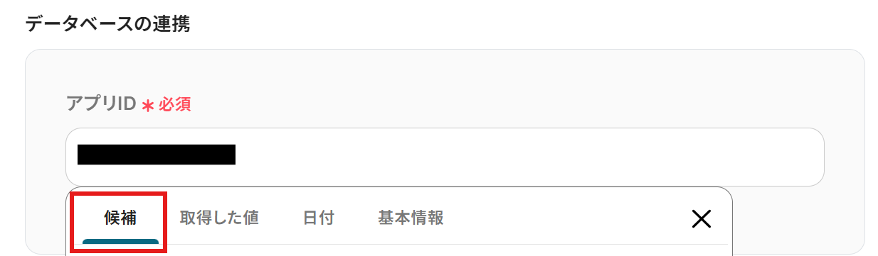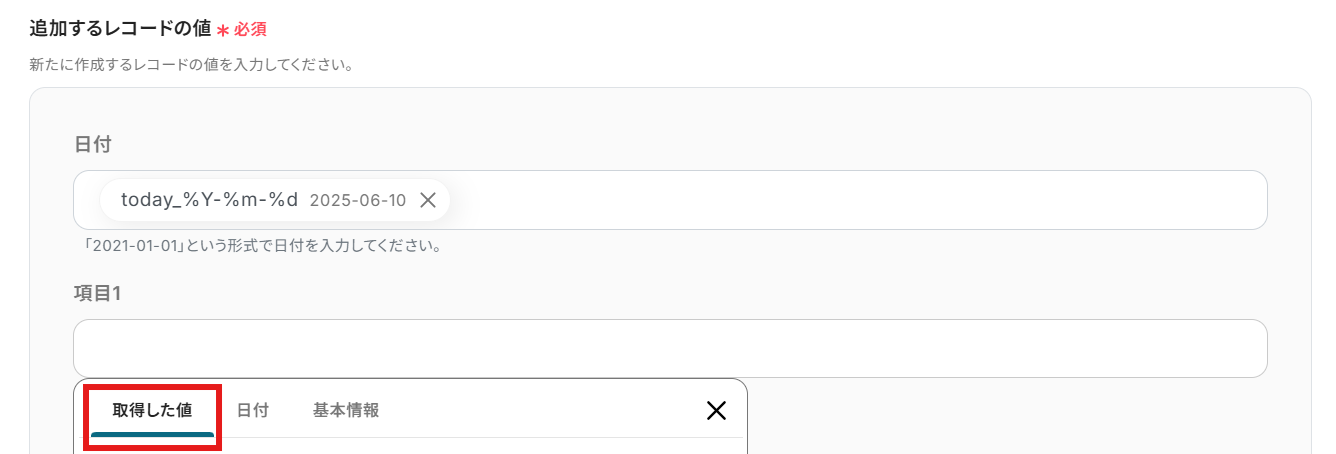 なお、手入力をしてしまうと、同じデータが重複してkintoneに登録されてしまうため、あらかじめ取得した値を引用するようにしましょう。