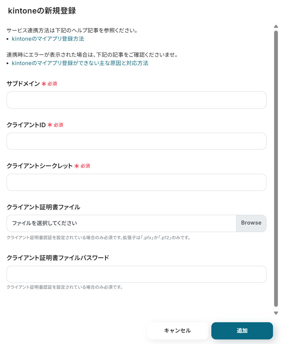 また、kintoneのマイアプリ登録がうまくいかない場合は、以下のリンク先を参照してください。kintoneのマイアプリ登録ができない主な原因と対応方法について 入力後、「追加」をクリックすると、kintoneのマイアプリ登録は完了です。