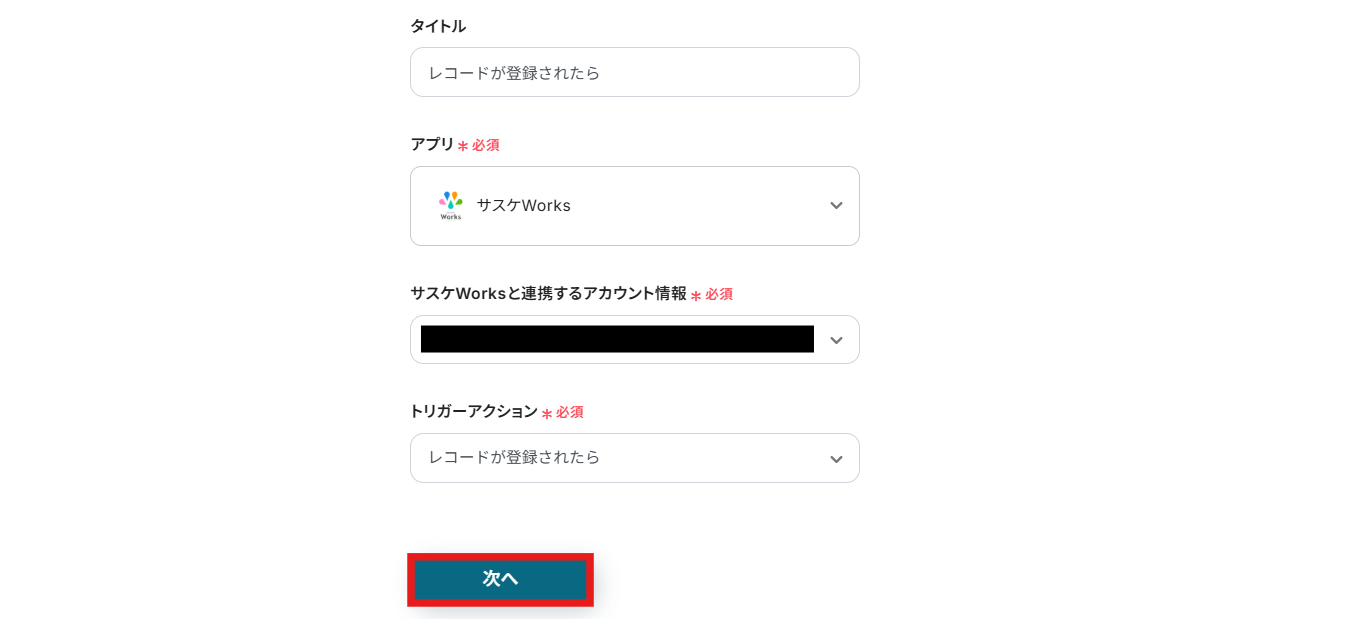 サスケWorksと連携するアカウント情報はプルダウンから選択します。 トリガーには「レコードが登録されたら」を選びましょう。 入力が終わったら、「次へ」を押して進めてください。