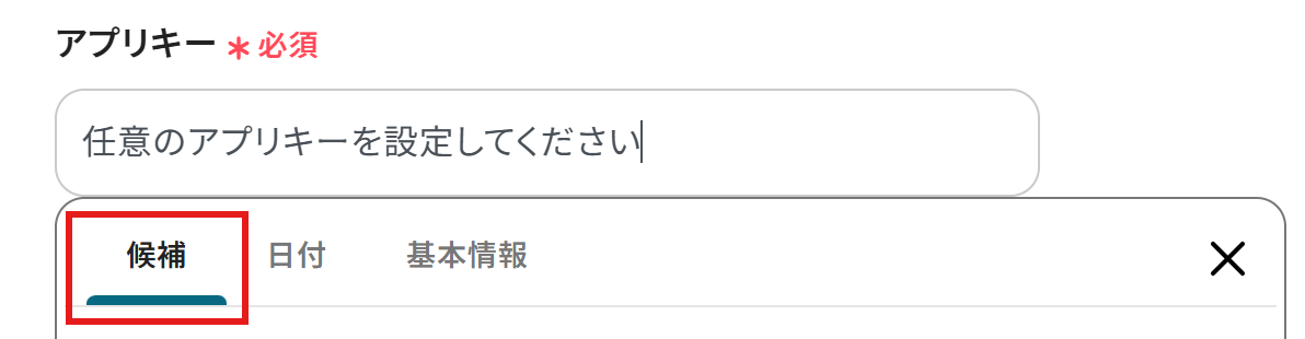 アプリキー: 入力欄をクリックすると候補が表示されるので、その中から選択しましょう。こちら を参考にしながらそのまま入力しても問題ありません。