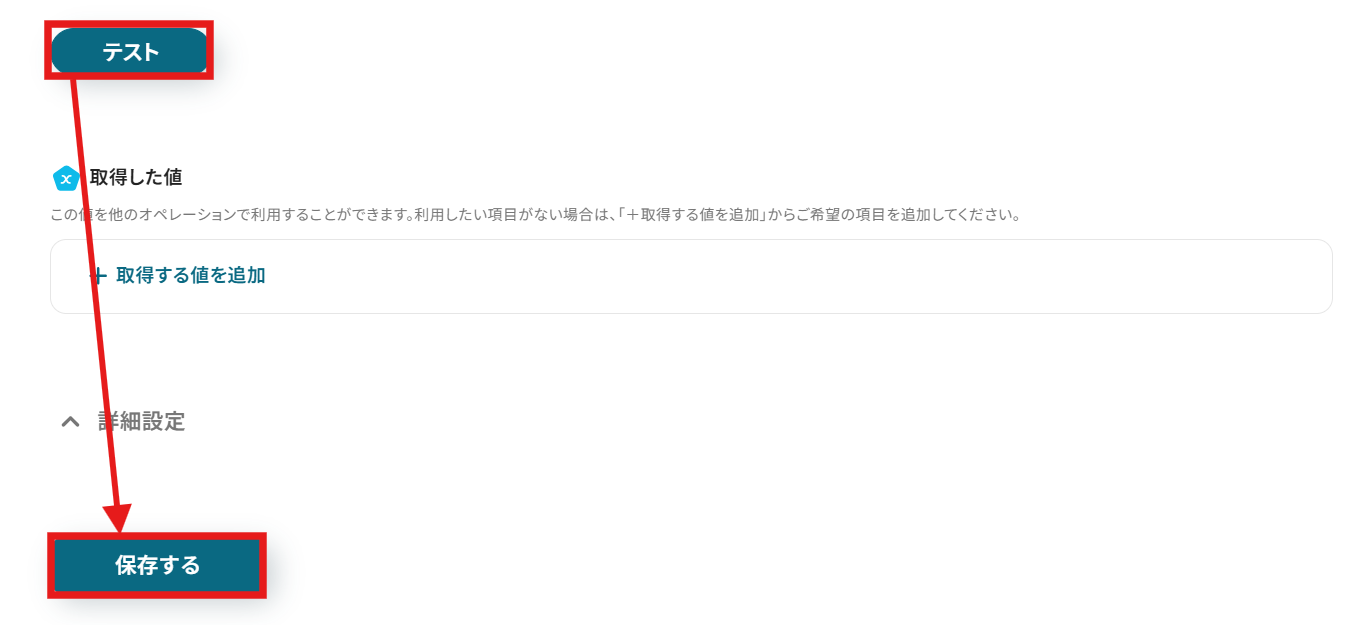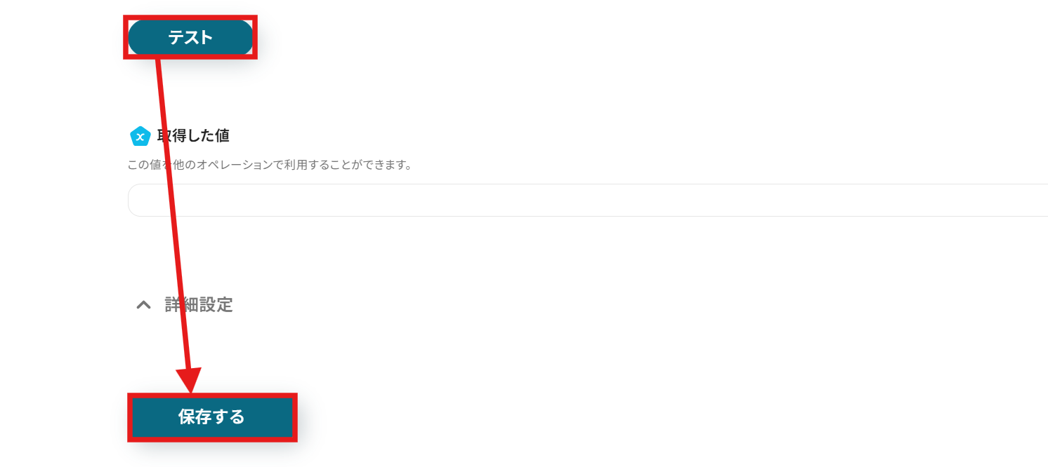 テストが正常に完了すると、「テスト成功」という画面が表示され、サスケWorksから取得した情報を引用できるようになります。 詳しくは以下のリンク先を参照してください。アウトプットについて テストが終わったら、「保存する」をクリックするのを忘れないようにしましょう!